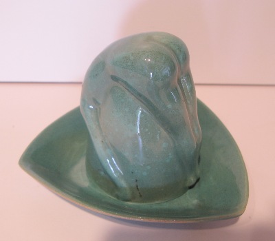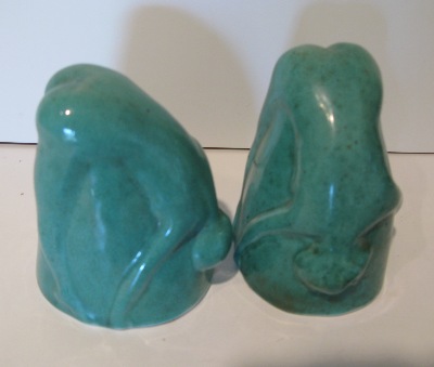 1.)Original open leg bottoms up 2.) later closed leg 3&4) ca.late 1940's ..early 1950's tall drink bottoms up. Note: the Tall drink bottoms up from the 1950s have a Round mouth... All other White Cloud Pottery bottoms up have an Oval Mouth!... Except the closed leg shot glass 2 1/4" high, thinking they were produced later, 40s or 50s. and they have Round mouth 2 & 1/32 outside diameter
